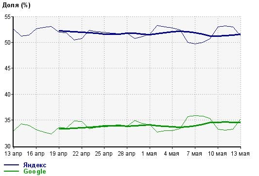 Уж не знаю, где Вы смотрели статистику поисковых систем, но LiveInternet на текущий момент показывает такую картину переходов с поисковых систем в рунете (исключены все, кроме 2х главных):