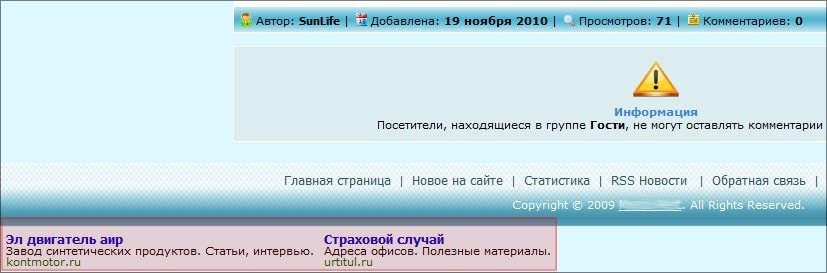 В последнее время участились случаи расположения кодов биржи ниже дизайна футера. Наши аналитики выявили крайне низкую эффективность таких ссылок или полное игнорирование их поисковыми системами. Пример размещения подобных ссылок: