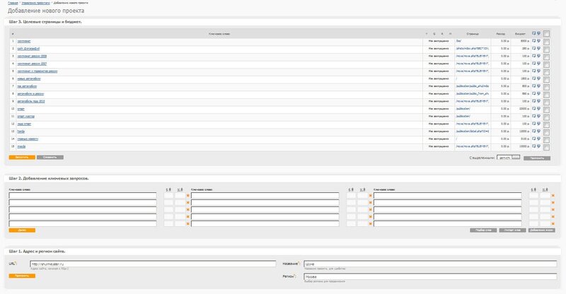 Простой режим пригодится тем, кто по каким-то причинам не обращается к SEO-специалистам, но всё равно хочет продвинуть сайт в ТОП поисковых систем. Пользователь вводит url сайта, а Система сама предлагает ключевые слова, определяет бюджет и ведёт проект. Запуск продвижения осуществляется в три шага, а созданный проект умещается на одной странице: