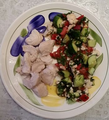 в 15-00 обед 120 гр куриной грудки +овощной салат