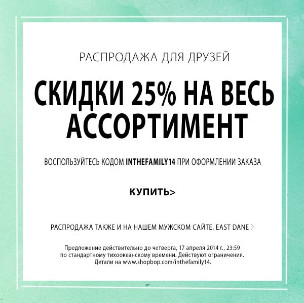 Отличная новость для fashion- и купонных партнёров! В магазине shopbop.com до 17 апреля грандиозная распродажа всего ассортимента со скидкой 25%. Более 700 международных брендов и моментальная доставка в Россию – разве не это нужно вашим подписчицам и посетителям сайтов?