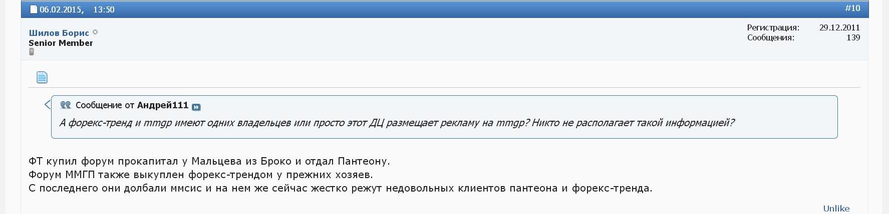 И ммжп был выкуплен Форекс Трендом и используется как инструмент оболванивания инвесторов.---------- Добавлено 08.02.2015 в 18:20 ----------Слова, не кого-нибудь, а представителя Альпари в России, господина Шилова. Ларчик открывается просто.