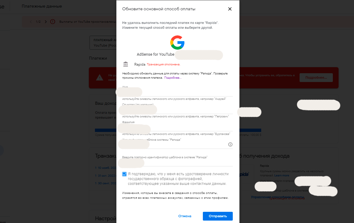 пришло письмо от гугла "Google AdSense: перевод не удался" - я вывожу на рапиду и на банк не менял. у меня платежи отменялись и создавались заново, все это время, но таких писем не было. смотрите скриншоты. вообщем я просто обновил инфу о шаблоне рапида и поставил опять на рапиду, посмотрим что будет. и да у меня адсенс ютуб, адсенс сайты у меня отключены.
