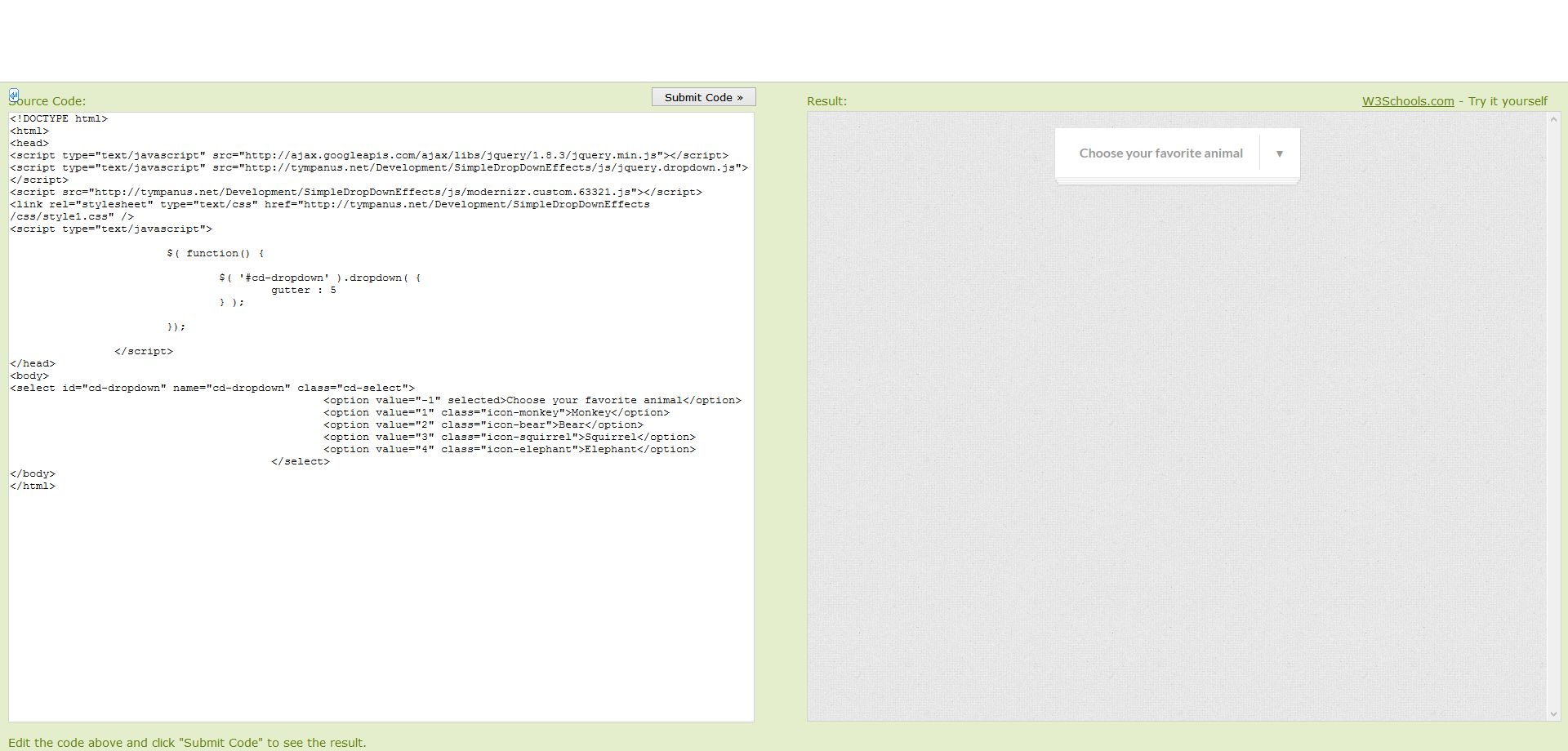 <!DOCTYPE html> <html> <head> <script type="text/javascript" src="http://ajax.googleapis.com/ajax/libs/jquery/1.8.3/jquery.min.js"></script> <script type="text/javascript" src="http://tympanus.net/Development/SimpleDropDownEffects/js/jquery.dropdown.js"></script> <script src="http://tympanus.net/Development/SimpleDropDownEffects/js/modernizr.custom.63321.js"></script> <link rel="stylesheet" type="text/css" href="http://tympanus.net/Development/SimpleDropDownEffects/css/style1.css" /> <script type="text/javascript"> $( function() { $( '#cd-dropdown' ).dropdown( { gutter : 5 } ); }); </script> </head> <body> <select id="cd-dropdown" name="cd-dropdown" class="cd-select"> <option value="-1" selected>Choose your favorite animal</option> <option value="1" class="icon-monkey">Monkey</option> <option value="2" class="icon-bear">Bear</option> <option value="3" class="icon-squirrel">Squirrel</option> <option value="4" class="icon-elephant">Elephant</option> </select> </body> </html>