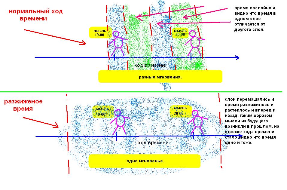 Вот тут все понятно на картинке. При обычном ходе времени мысли в голове находятся в разное время, а при разжижении вы уцепили свои мысли которые возникли от разговора который будет через час. Все просто.