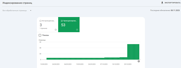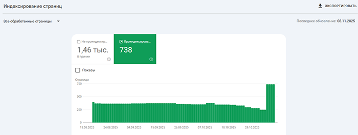 Индексация сайтов в нашем сервисе работает стабильно и эффективно. Примеры на скриншотах из Google Search Console