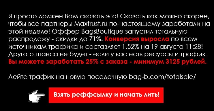 Друзья, специальное предложение для партнеров оффера Bags Boutique: максимальное партнерское вознаграждение за всю историю проекта Maxtrust! С 16 по 22 декабря включительно* мы отдаем 30% партнерам! Эта акция уникальна и не повторится больше ни-ког-да. Если вы работали с Bags Boutique и продолжаете сотрудничать, то вам гарантировано увеличение дохода без усилий! Если вы только приглядывались к сумочному офферу, самое время начать действовать и получить отличный старт.