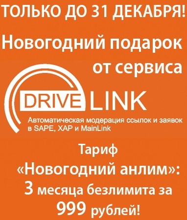 Наш новогодний подарок для новых пользователей DriveLink — лучшей системы проверки ссылок и доноров в SAPE, MainLink, LinkFeed и SetLinks — 3 месяца безлимитного использования за 999 рублей! Ссылки — один из ключевых факторов ранжирования в поисковых системах, но ужесточение «требований» к сайтам делает многие ссылки, страницы и сайты плохими донорами. Плата за заведомо нерабочие ссылки в среднестатистическом проекте составляет от 20% до 90%.