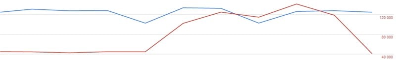 Ну собственно и скрин: красное просмотры страниц, синее доход.