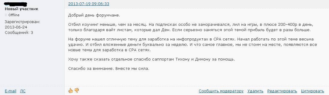 Еще часто задают вопрос: через какое время я смогу отбить коучинг? Отвечаю: Все зависит напрямую от Вас. То, что будет зависеть от меня – я предоставляю. Если Вы будете стабильно и плотно работать, фантазировать, много тестировать и не опускать руки через 10 минут после начала работы – то коучинг отбивается за месяц максимум. Но я этого гарантировать не могу. Есть люди, которые за неделю два раза отбили стоимость коучинга, а есть которые за месяц заработали 10-15тыс, так как часто пропадали и ничего не делали.