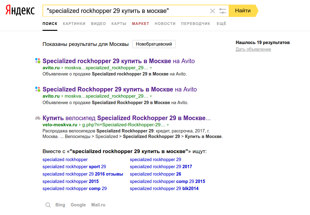 Хах, "specialized rockhopper comp 29 купить в москве" без кавычек, первая ссылка на авиту, ну что за бред я не писал бу. =))))