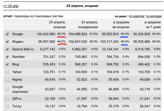 В средний вторник яндекс выигрывал у гугла 3.5%