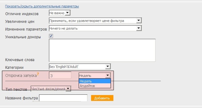 Быстрая закупка ссылок губительна для продвигаемого проекта (купил за 1 день 2000 ссылок - получить целый набор неприятностей). Ранее система отсрочки закупки по фильтрам работала только для автоматических режимов, теперь, в рамках работ над созданием открытой платформы для профессионалов мы выводим параметр отсрочки закупки по фильтрам в открытый доступ.