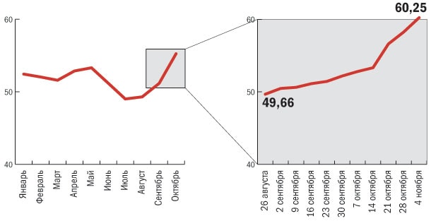 Уже 61 почти. Вообще первые 10-15 минут, даже 1-2 часа, торгов не очень показателен, но видимо ЦБ решил обойтись без инъекций. Хотя ЦБ определять курс на завтра...