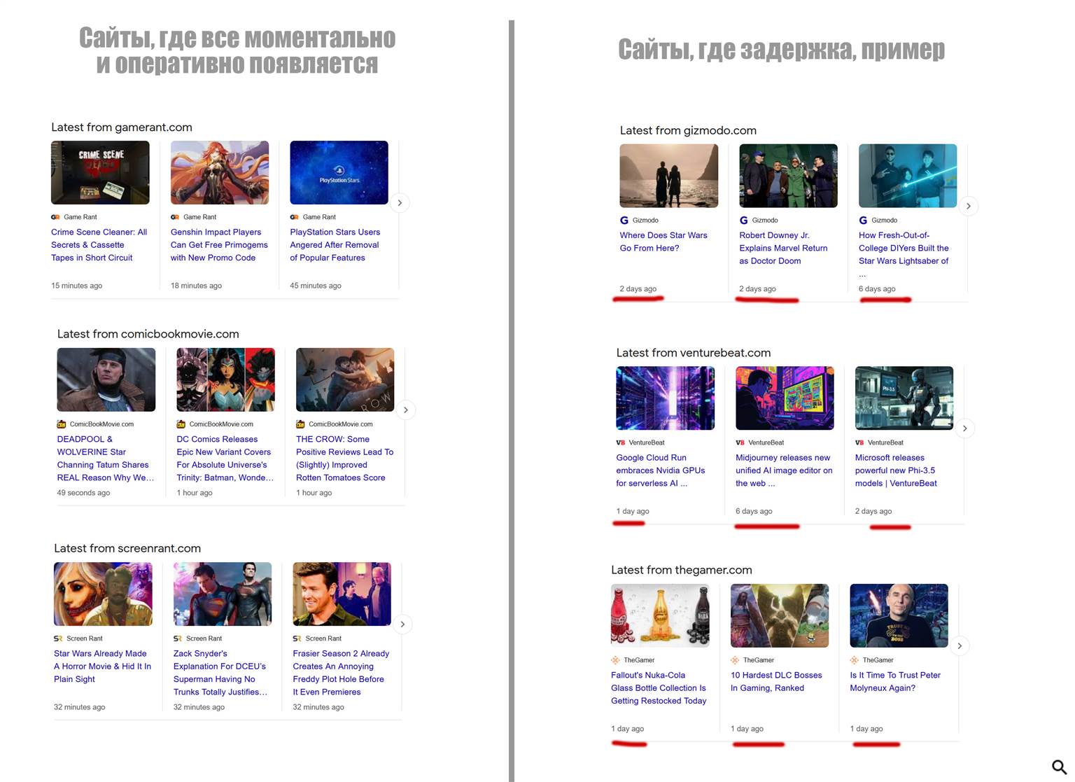 Снипет это просто отражение нового алгоритма или бага. Такое ощущение, что сайты справа.. попадают в ранжирование с задержкой. Либо баг, либо фича. Третий вариант ... Может быть позиции этих сайтов справа по ключевикам слабые и статьям не хватает. Но почему тогда все статьи с задержкой.. ключевики разные же у всех. Просадка по сайтам а не по ключевикам.