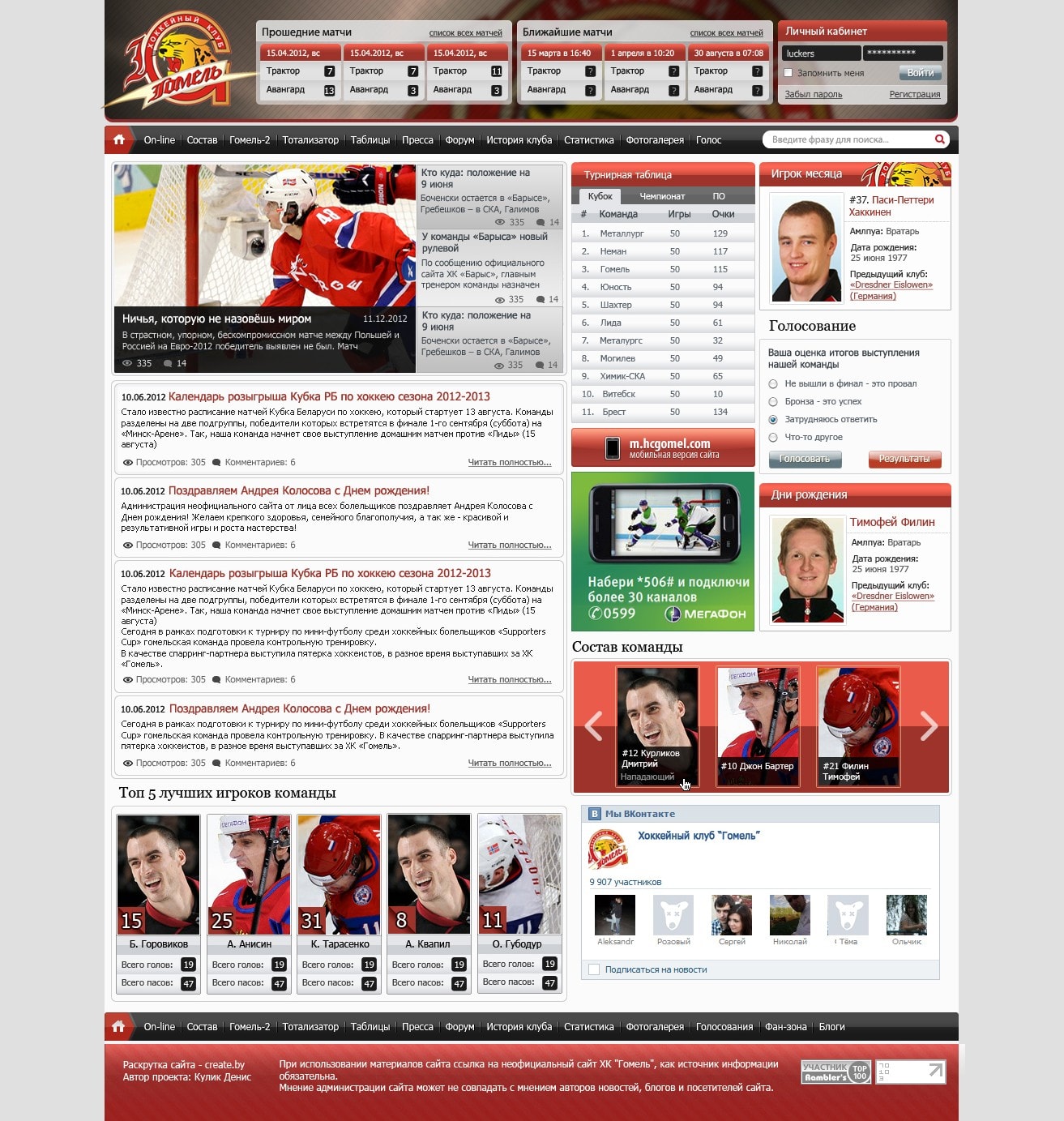 Итак, победителем конкурса на редизайн неофициального сайта хоккейного клуба "Гомель" объявляется - miraha, которому наиболее близко удалось воплотить наши пожелания в конечный продукт. Поздравляю победителя!