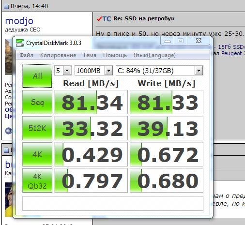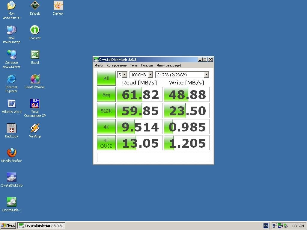 Установил на него первую попавшуюся сборку WindowsXP+SP2 и запустил CrystalDiskMark.