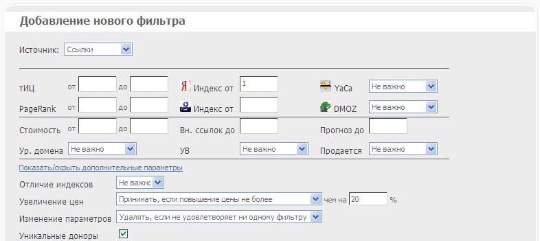 1. Изменение параметра "наличие сайта в индексе Yandex/Google" на "индекс Yandex/Google от": благодаря данному параметру Вы сможете отбирать доноры с большим количеством страниц в индексе, следовательно, с меньшей вероятностью подверженного АГС.