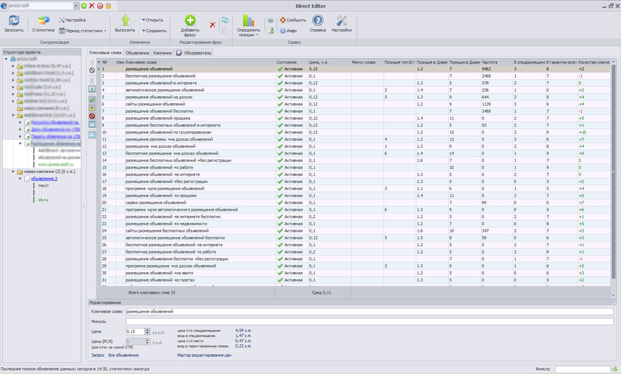 Предлагаем вам оценить новую функцию DirectEditor для анализа текущей ситуации “Определение позиций”. Для выбранных фраз или всех фраз выбранного объявления/компании программа запросит страницу результатов поиска Яндекс с учетом выбранного региона. Для опытного глаза на этой странице очень много полезной информации: