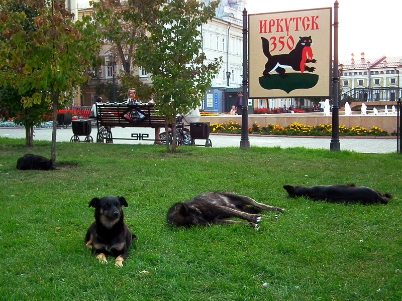 Сегодня было жарко, собаки на площади у Цирка устроили пляж.