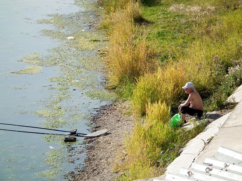 И мужичок рыбачит, одевшись совсем не по-осеннему:
