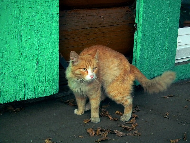 Кот, конечно, нашел горстку опавших листьев, где потоптаться перед "важными делами":