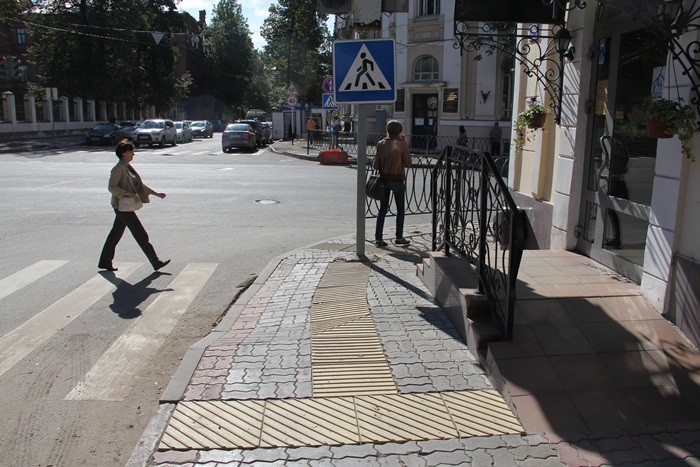 На самом деле для слепых имеют значения рёбра на этих плитах, куда направлены рёбра, туда и надо идти, поэтому никакой слепой не ударится о столб, а пойдет через переход.