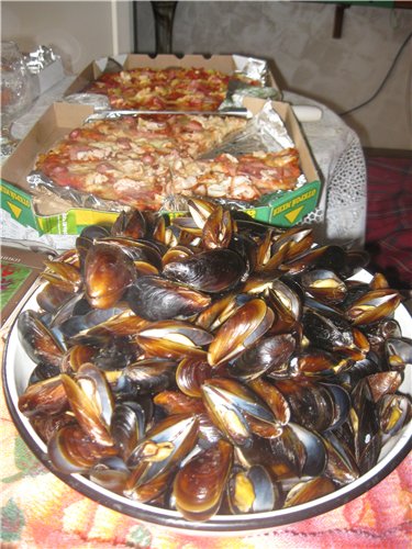 Если одни грузят апельсины бочками, то мы едим мидии мисками :)) Только с моря. Часа два прошло от лова до приготовления. Ну и пицца :)