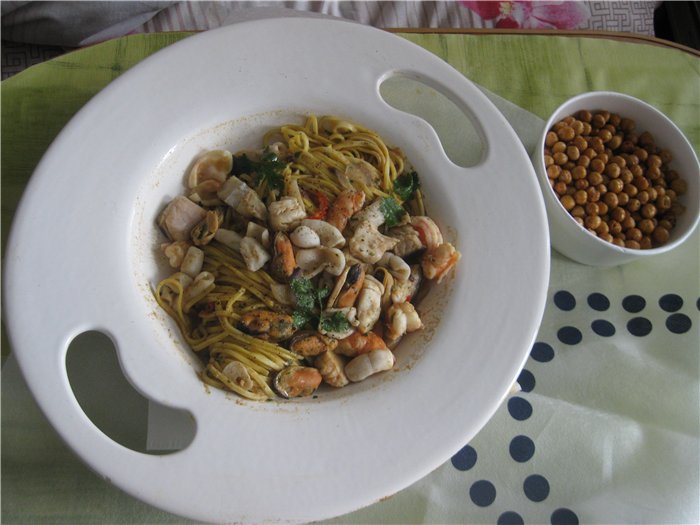 Сегодня у меня праздник с доставкой на дом :) Самая вкусная паста с морепродуктами из любимого ресторана и комплект от шефа - жаренный нут:)