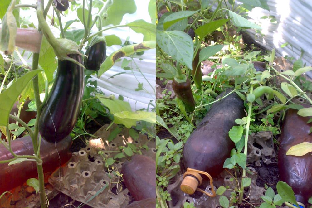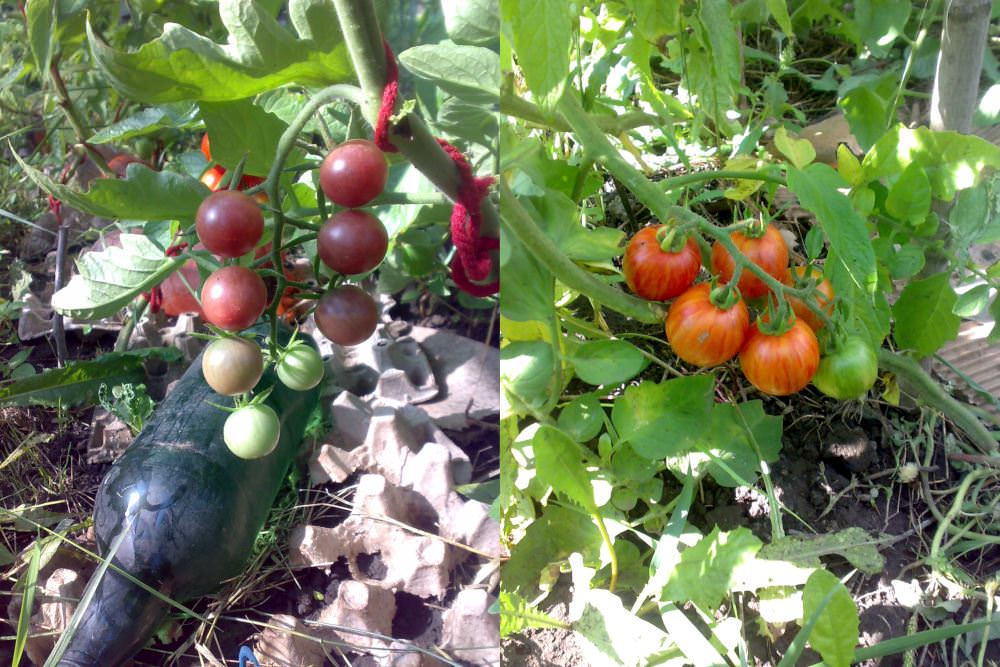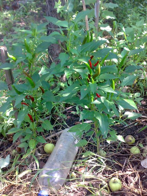 Синенькие и перец "сладкий шоколад" (правда, ракурс с перцем неудачный получился, сорри ;)). Между ними в этом году решили поробовать посеять бобы.