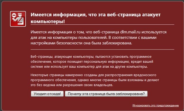 результат окно Имеется информация, что эта веб-страница атакует компьютеры!