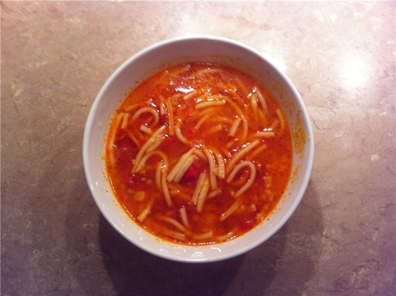 В кастрюлю наливаем масло, разогреваем. Помидоры натираем на терке, еще был перец красный-туда же и чеснок. Все это дело варим/жарим минут 40. Потом все бульон. Еще картошечки. Ну и макарончиков. Были только спагетти, пришлось поломать. Ну и перец, соль и тд.