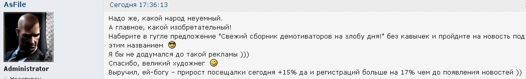 А теперь про "негативный пиар". Вася почитай свой "самый честный" форум, твой жопо-пахан, не раз подчеркивал, что плевал он на серч и на то что на нем пишут. Мало того он неоднократно подчеркивал то, что черный пиар - офигенно помогает в развитии ФО, при этом указывая конкретные цифры, вот только один из примеров: