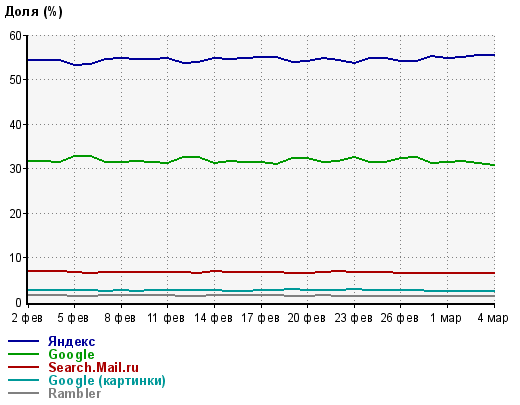 Да такова падения гугла я не видел в среднем в субботу 32.5% сегодня 30.1% 2.4% потерь за неделю. Google (картинки) среднем в субботу 2.7% сегодня 2.3% 0.5% потерь за неделю вот качество поиска просто шикарное. За то Яндекс в среднем в субботу 53.7% сегодня 56.1% вырос на 2.4%.