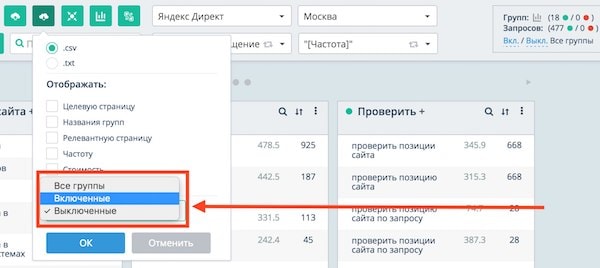 Появилась возможность выгружать запросы из только включенных или только выключенных групп.